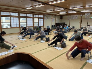 4回目の「運動」では、参加者から見本となる方に出てきてもらい、前で運動していただきました。講師さんの進行に合わせ資料を見ながら運動することで、自分達だけで行うイメージがつかめたのではないでしょうか。