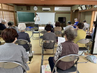 13人の方が参加され「座学」「運動」「知的活動」という「とっとり方式認知症予防プログラム」の一連のサイクルを体験しました。運動プログラムでは、資料に沿って丁寧に行ったので、「簡単にできて良かった」「資料を見ながら家でもやってみる!」など感想をいただきました。モデル地区は月1回ですが、お家でも「運動」や「知的活動」に取り組んでいただけるとうれしく思います。