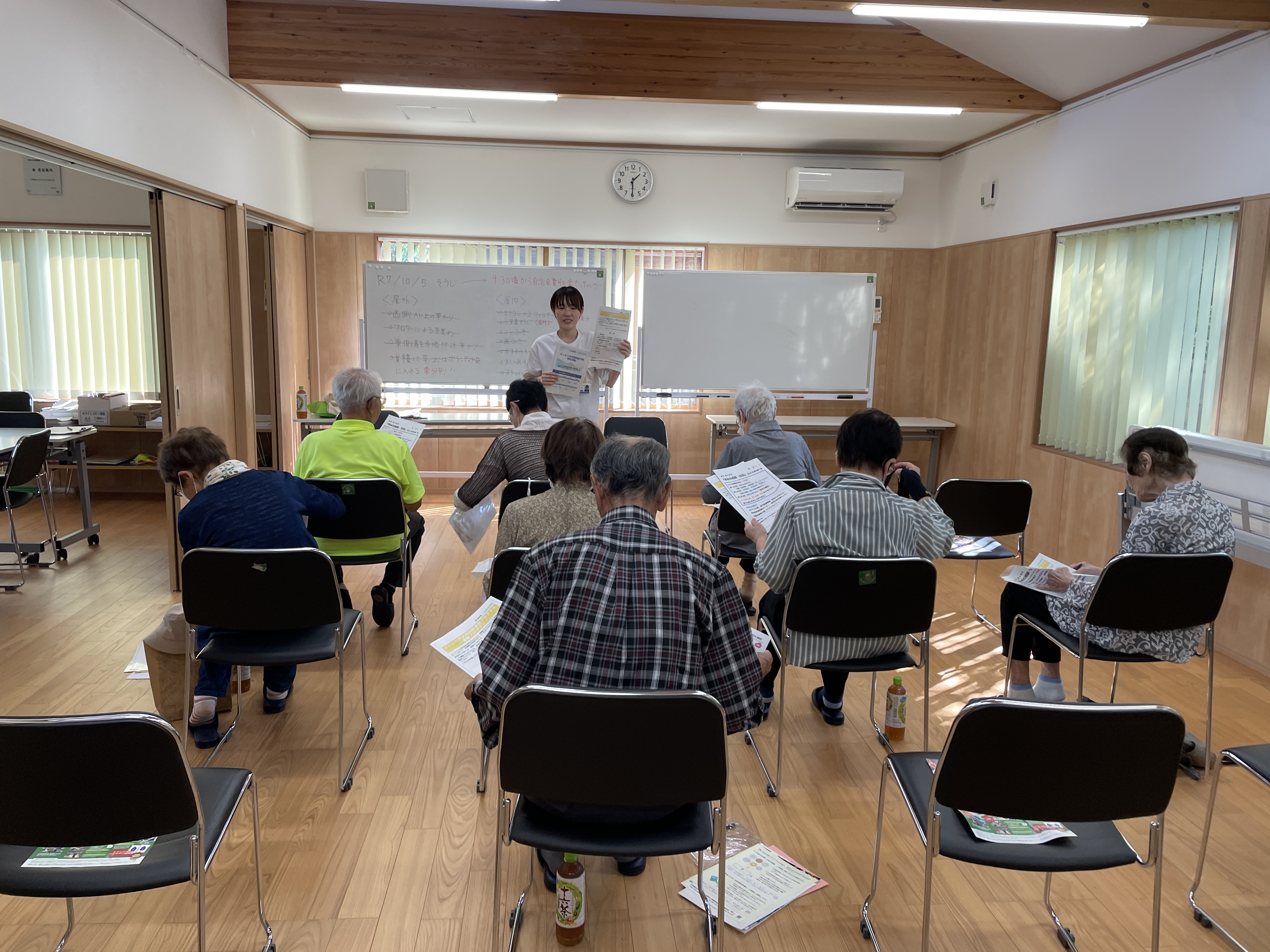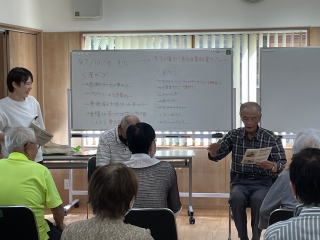 3回目と4回目の「運動」は、参加者の中から進行役に1人、見本役に2人前に出てきてもらい運動していただきました。クラブの代表の方が進行役をつとめたのですが、一つひとつの動きへのポイント説明が分かりやすく、納得しながら体操ができました。今後もクラブ活動に取り入れて認知症予防やフレイル予防をして行きましょう。