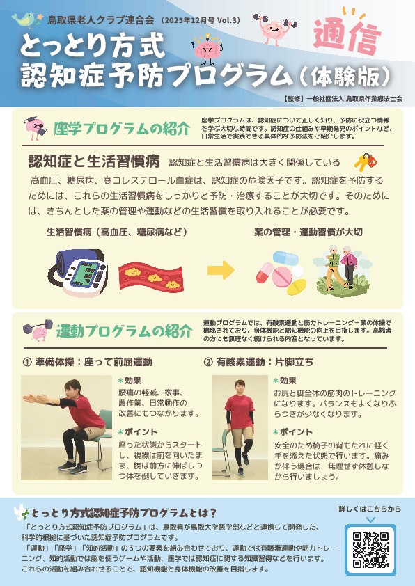 また、短時間で「とっとり方式認知症予防プログラム」を体験できる内容です。認知症予防やフレイル予防のために、是非みなさまのクラブやサロン活動で取り組んでみてください。