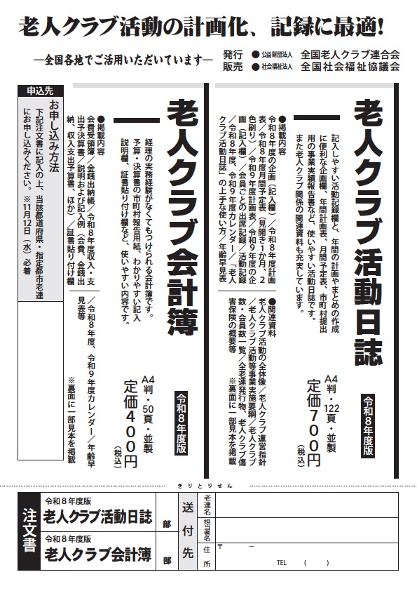 令和8年度版「老人クラブ活動日誌」「老人クラブ会計簿」 令和8年度老人クラブ活動日誌、会計簿の申込受付中 申込書はこちら (申込期限 11月12日(水)) ご希望の方は、市町村老連事務局にお申し出ください。