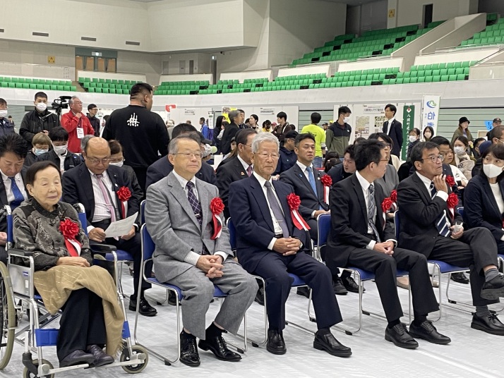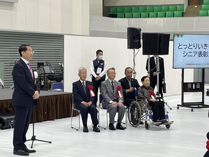 オープニングでは、石破議員と平井伸治鳥取県知事が挨拶を行い、県民の楽しみづくりや仲間づくり、地域の活性化に寄与している高齢者へ、平井知事より「とっとりいきいきシニア表彰」が贈られました。続くオープニングアクトでは、白兎保育園の園児が元気いっぱいに「しゃんしゃん傘踊り」を披露し、会場を温かな雰囲気で包み込みました。