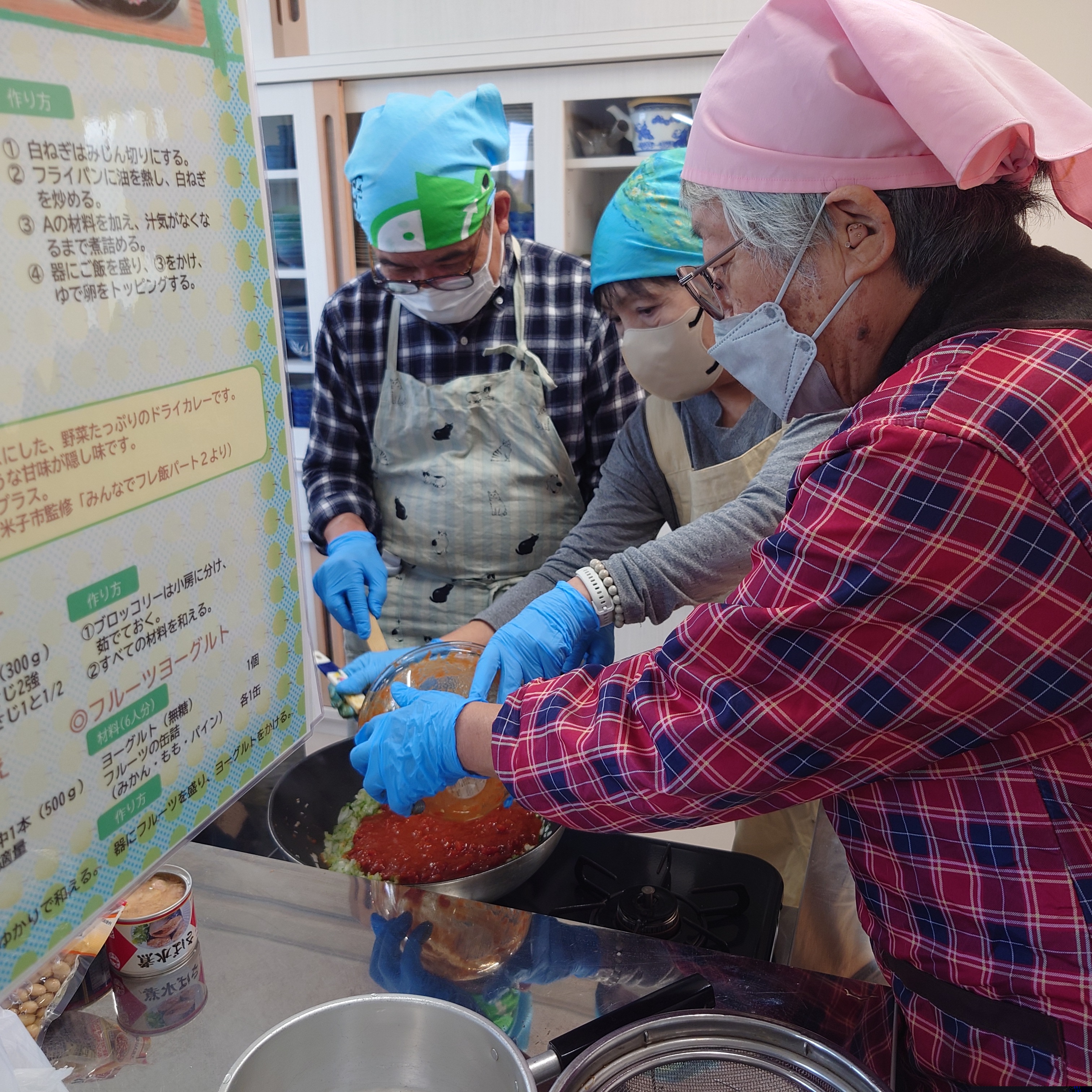 誰でも簡単に作ることができる料理を学び、地域や家庭に持ち帰り実践することでフレイル予防に繋げていただこうと「男と女との料理教室」を東部・中部・西部に分かれて開催しました。参加者全員が、家でも作れるように、1つひとつの行程をゆっくりと行いました。多くの参加者から、「意外と簡単だったので家でも作れそうだ」「家でも作ってみたい」と感想をいただきました。食事で栄養をしっかりとることがフレイル予防に繋がります。今回の料理教室のメニューを掲載しますので、みなさんも是非、作ってみてください。【参加者数】77人