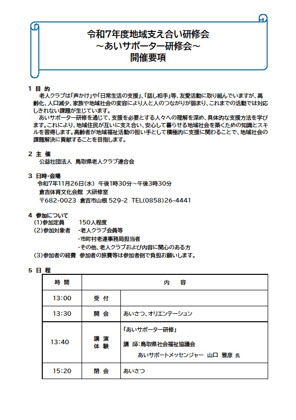 あいサポーター研修を通じて、支援を必要とする人々への理解を深め、具体的な支援方法を学びます。これにより、地域住民が互いに支え合い、安心して暮らせる地域社会を築くための知識とスキルを習得します。高齢者が地域福祉活動の担い手として積極的に支援に関わることで、地域社会の課題解決に貢献することを目的とします。