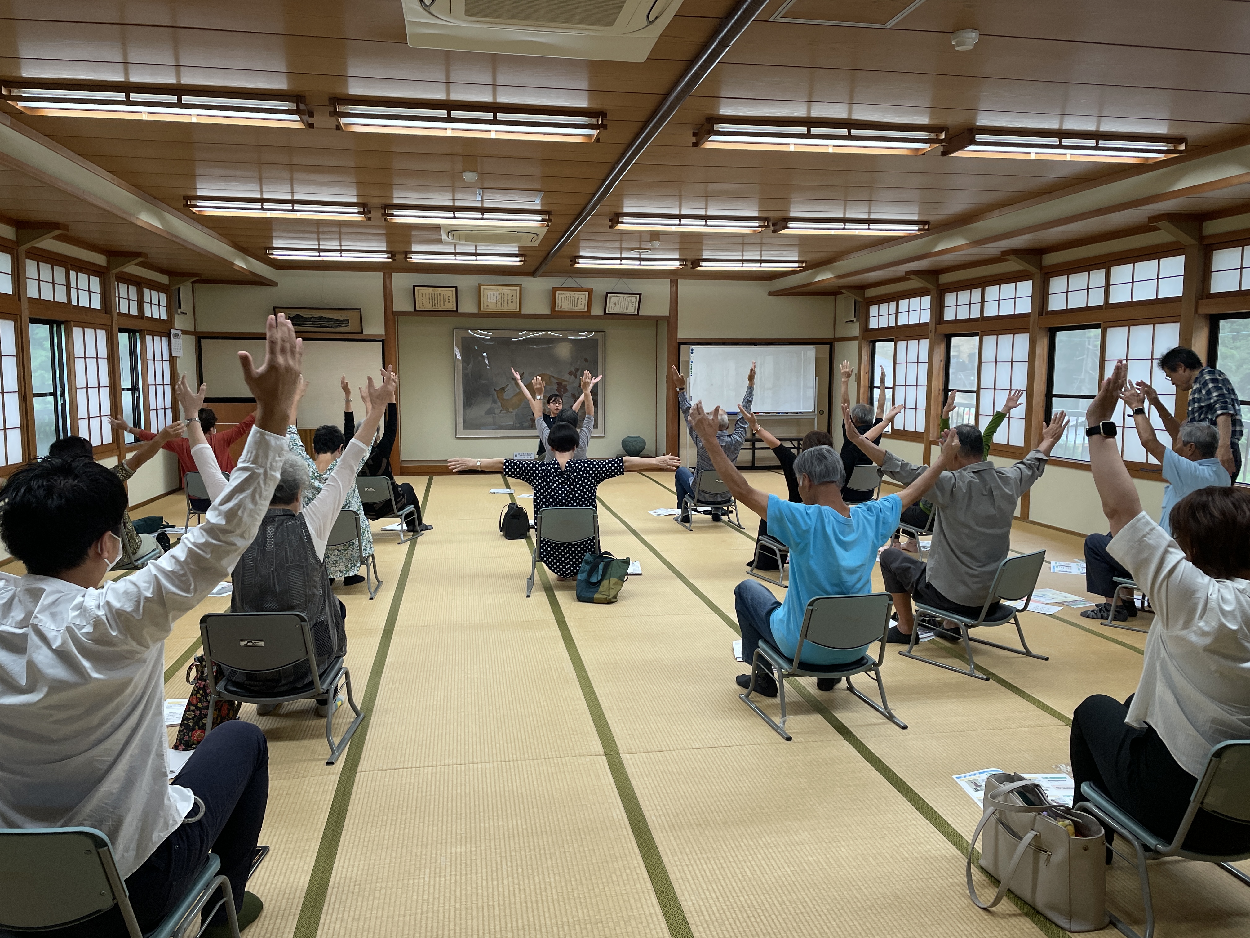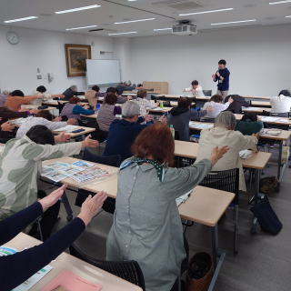 4回目の「運動」では、参加者から見本となる方に出てきてもらい、前で運動していただきました。講師さんの進行に合わせ資料を見ながら運動することで、自分達だけで行うイメージがつかめたのではないでしょうか。