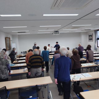 地区老人クラブでの実施ということで単位クラブの代表30人が「とっとり方式認知症予防プログラム」に取り組みました。4回の体験後、単位クラブ活動にも取り入れていただけるとうれしく思います。「座学」では、認知症について簡単に学びました。「認知症」は、みなさんにとって1番の関心事。認知症が疑われる事例について聞きながら、「変化」に早く気づくことの大切さを学びました。