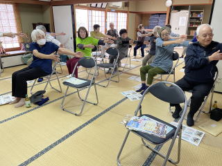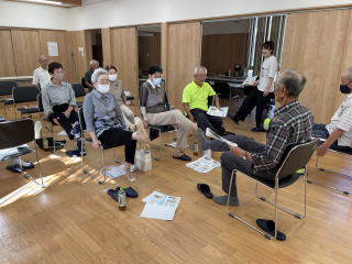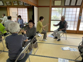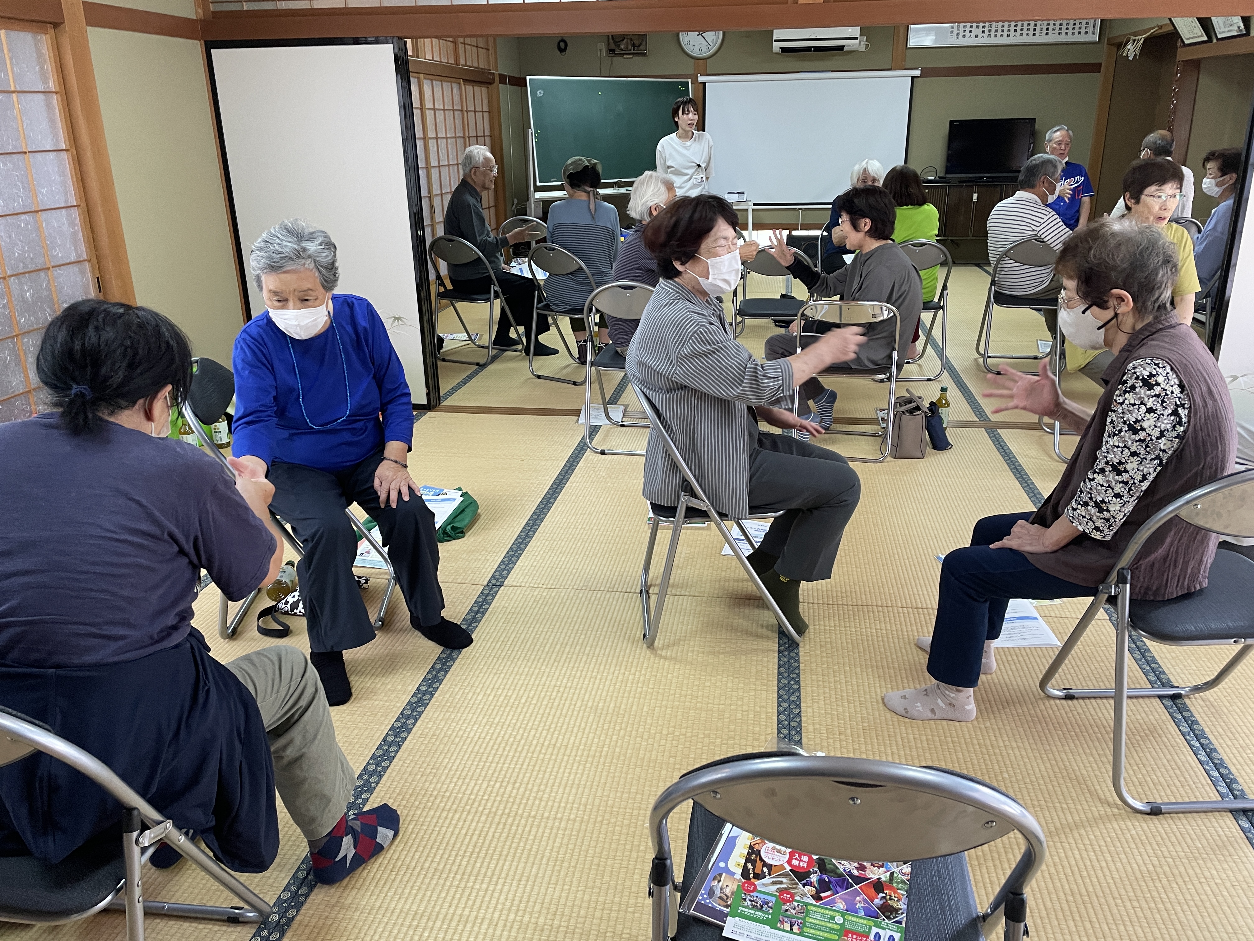 3回目と4回目の「運動」は、参加者の中から進行役に1人、見本役に2人前に出てきてもらい運動していただきました。クラブの代表の方が進行役をつとめたのですが、一つひとつの動きへのポイント説明が分かりやすく、納得しながら体操ができました。今後もクラブ活動に取り入れて認知症予防やフレイル予防をして行きましょう。