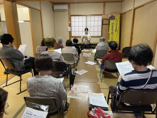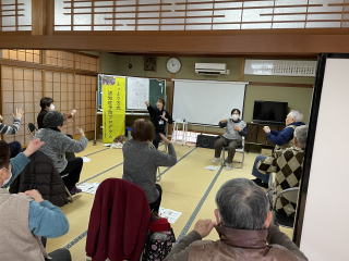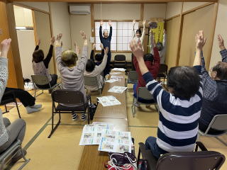 13人の方が参加され「座学」「運動」「知的活動」という「とっとり方式認知症予防プログラム」の一連のサイクルを体験しました。運動プログラムでは、資料に沿って丁寧に行ったので、「簡単にできて良かった」「資料を見ながら家でもやってみる!」など感想をいただきました。モデル地区は月1回ですが、お家でも「運動」や「知的活動」に取り組んでいただけるとうれしく思います。