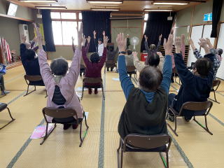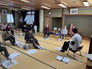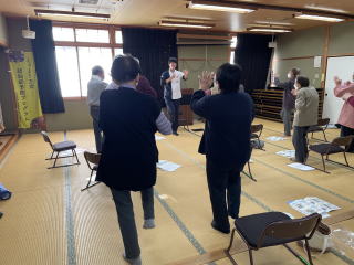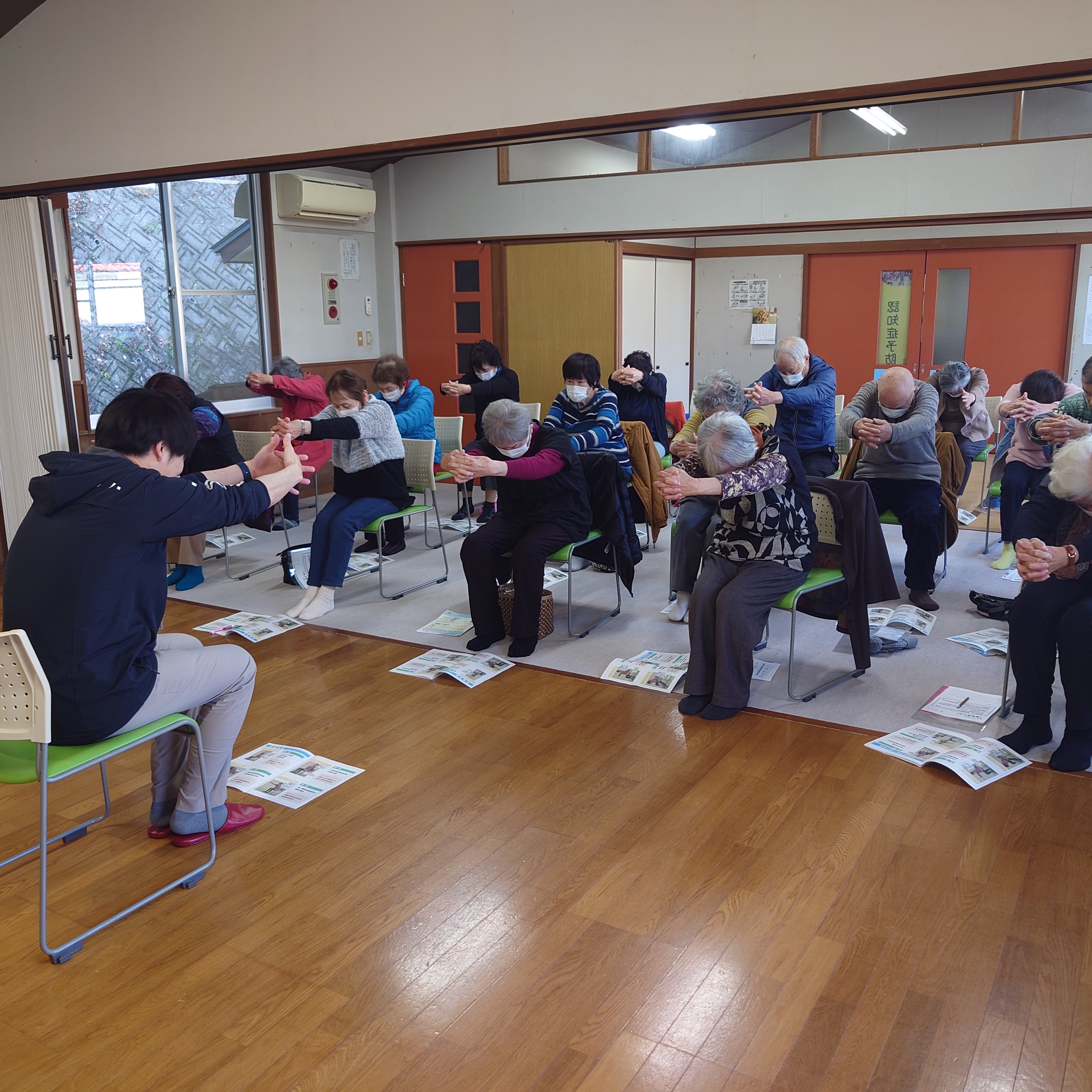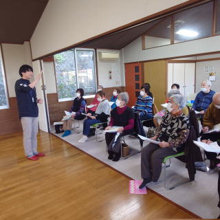 12月10日、鳥取市用瀬町大村公民館で体験会を開催しました。18人の参加者は、60分に短縮した「とっとり方式認知症予防プログラム」の体験版に取り組みました。「座学」では、5分程度の短い時間でしたが、講師さんからのお話を頷きながら聞いておられました。「運動」では、お家や自分たちの今後の活動でも取り組めるようにお配りした資料に沿って丁寧に行いました。頭の体操では、間違えなくなるまで何度も繰り返し行うなど、積極的に取り組まれました。ひまわりの会の活動は、月に1回、お昼の食事会を挟み、午前と午後の1日がかりで行うそうです。これからの活動には、是非「とっとり方式認知症予防プログラム」の運動等取り入れていただき、認知症予防やフレイル予防に繋げていただきたいと思います。