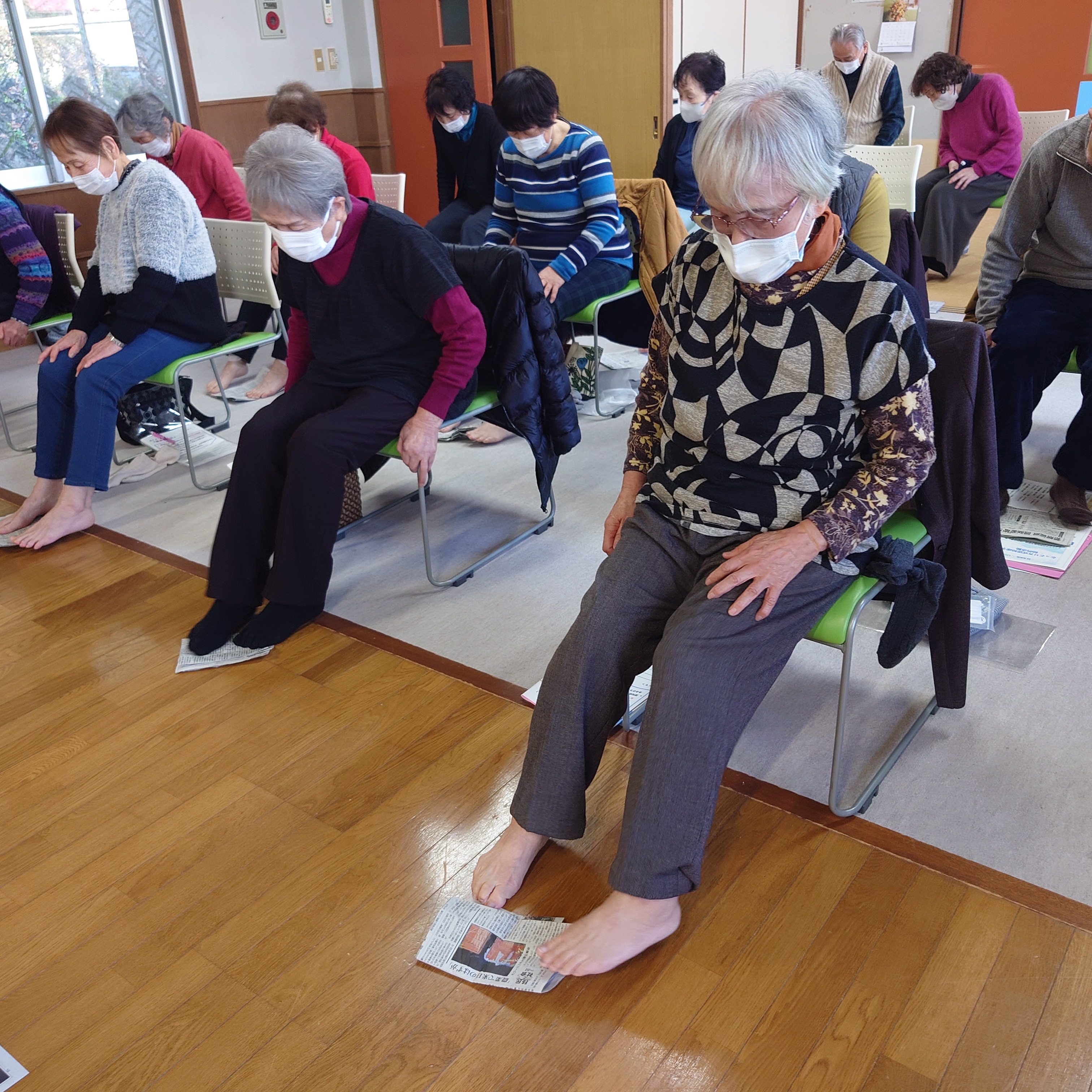 12月13日、鳥取市美萩野3丁目町内会館で体験会を開催しました。21人の参加者は、「とっとり方式認知症予防プログラム」の体験版を和気あいあいとした雰囲気の中、楽しみながら体験されました。知的活動の「折りたたみ新聞紙」は、足指を使って新聞紙を小さくなるまで折りたたむ活動です。みなさん足だけを使って、新聞紙が足の裏に隠れるくらいの大きさになるまで折りたたむことができました。足指がしっかり使えるようになると転倒防止に繋がります。お家でもやってみてください。このクラブに参加して、みんなで楽しい時間を過ごすことが、何よりも認知症予防に繋がります。これからも、クラブ活動を継続していただき、「とっとり方式認知症予防プログラム」の運動や知的活動を取り入れていっていただきたいと思います。